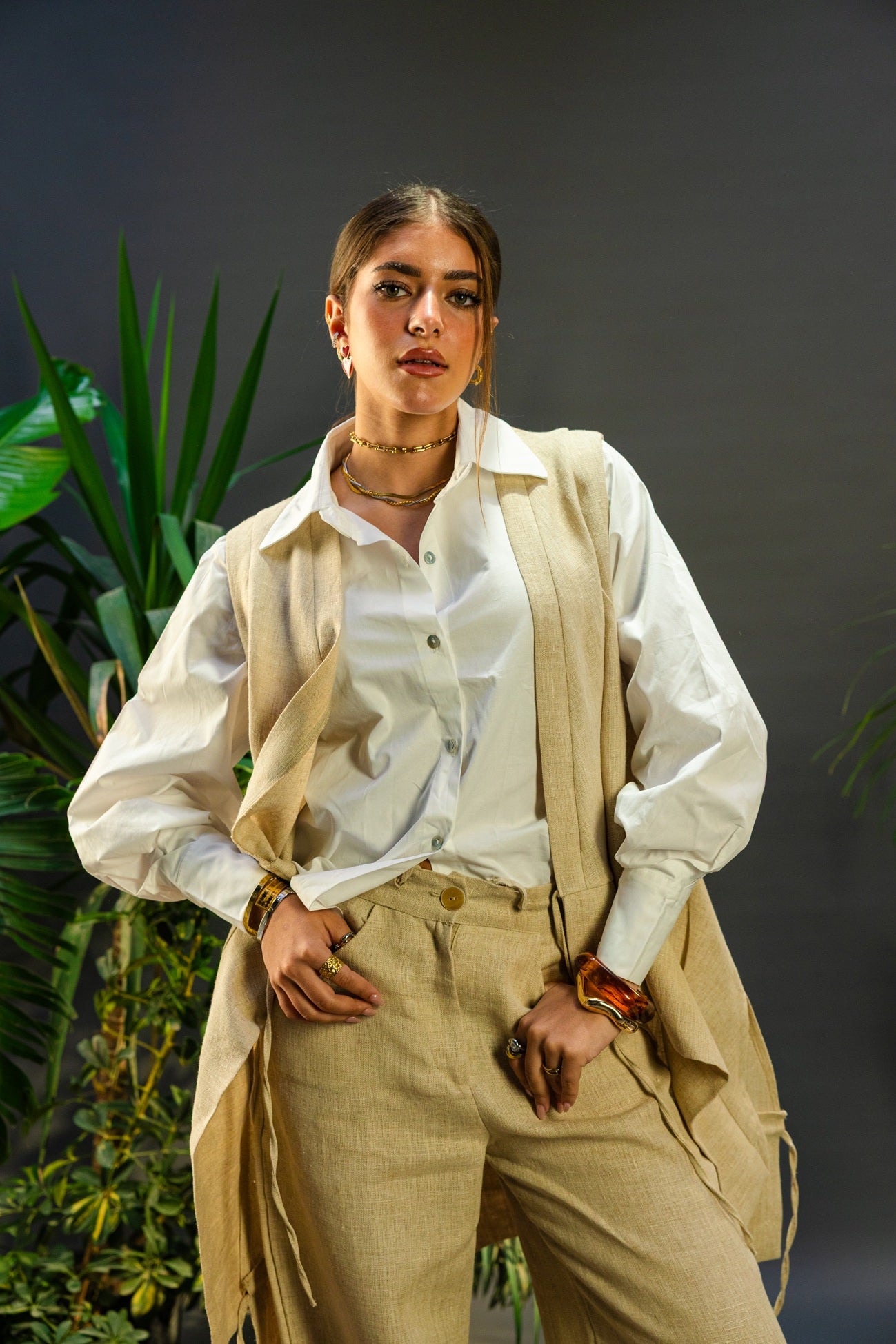 The Bello Vest is crafted from pure linen, combining structure with ease. Its tailored cut and minimal design bring a refined touch to laid-back days. Perfect for layering or wearing solo
