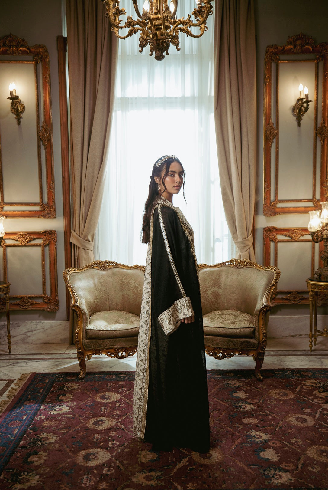 The Halima Kaftan, crafted from LINEN WITH INDIAN LINEN EMBROIDERY, brings together the lightness of linen and the charm of intricate handwork. Its elegant design is enhanced by the rich embroidery, making it a standout piece for those who value exquisite detail.