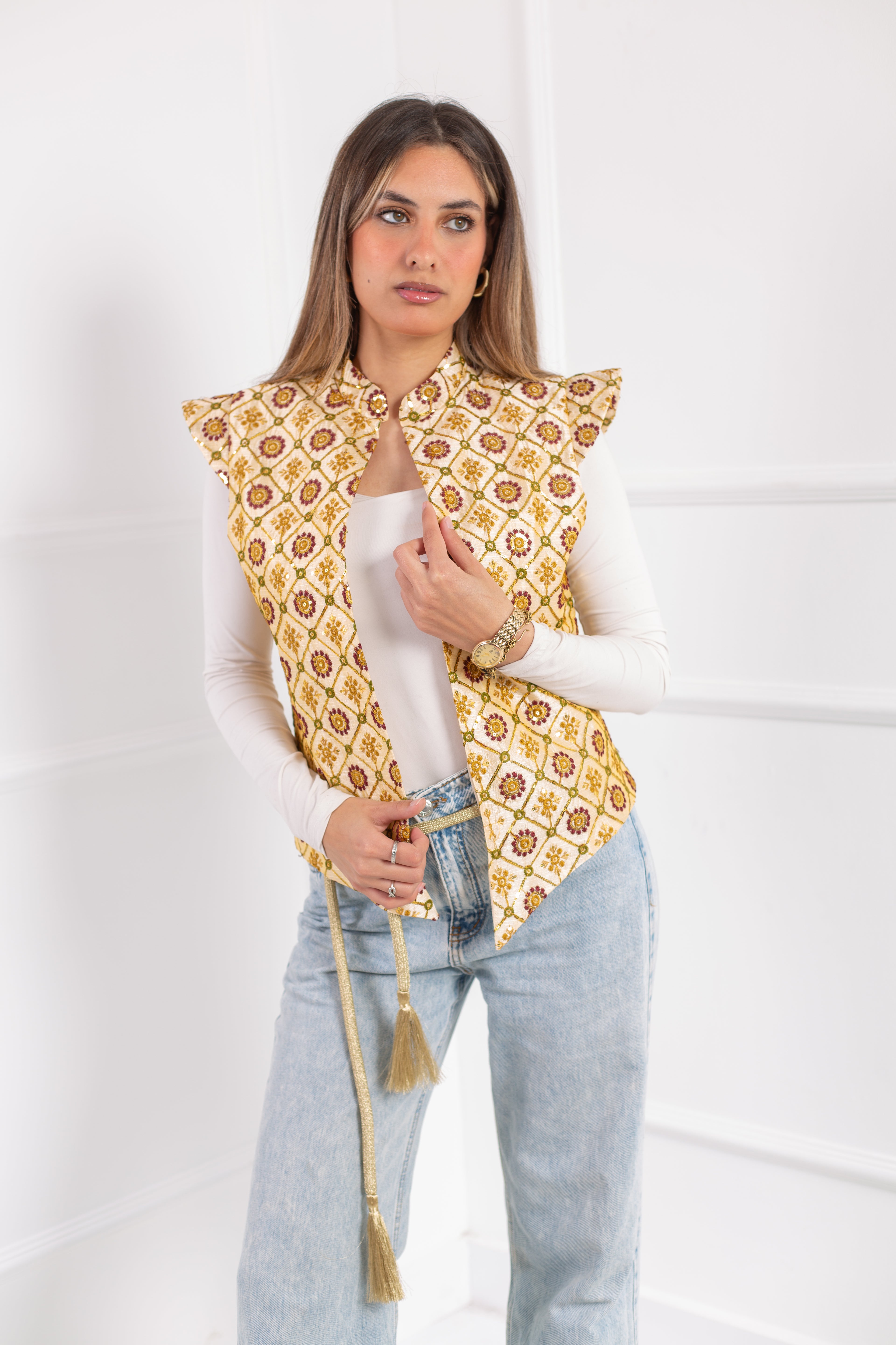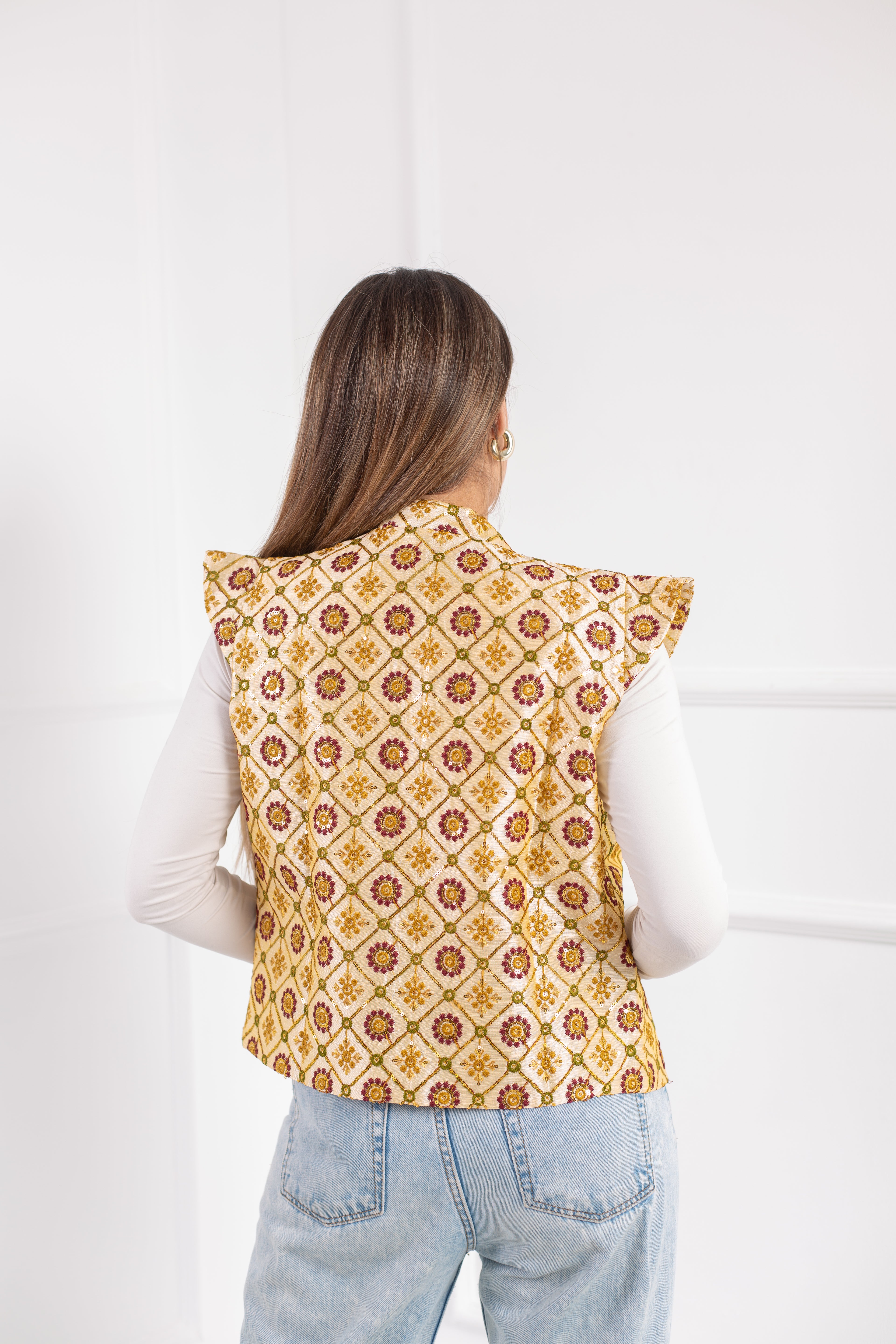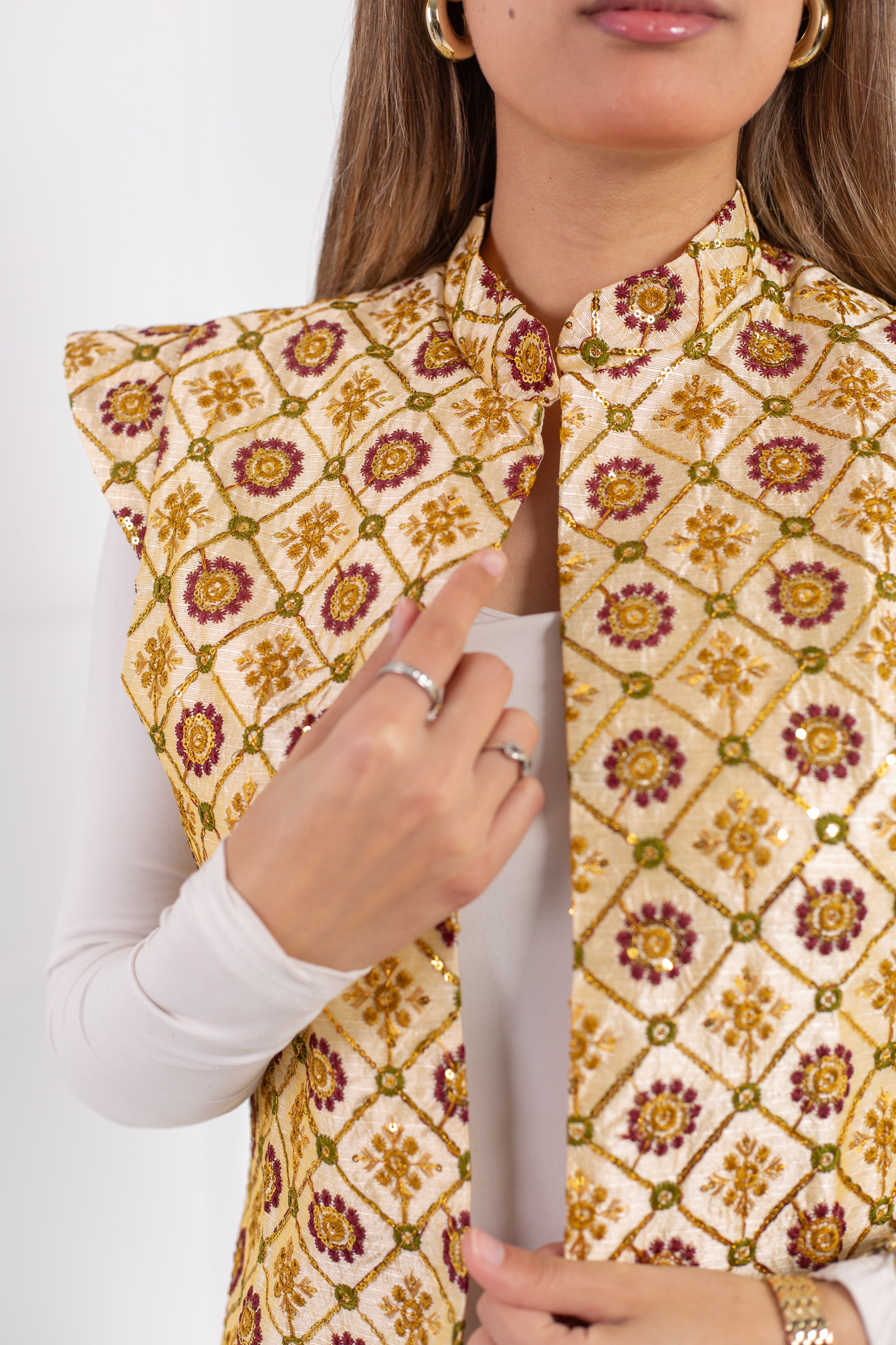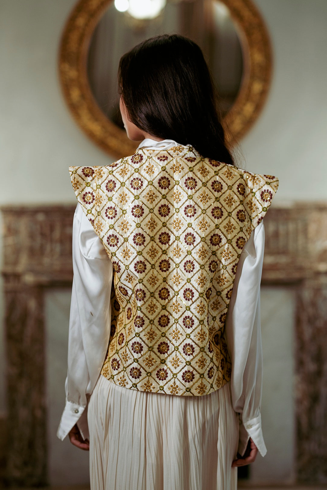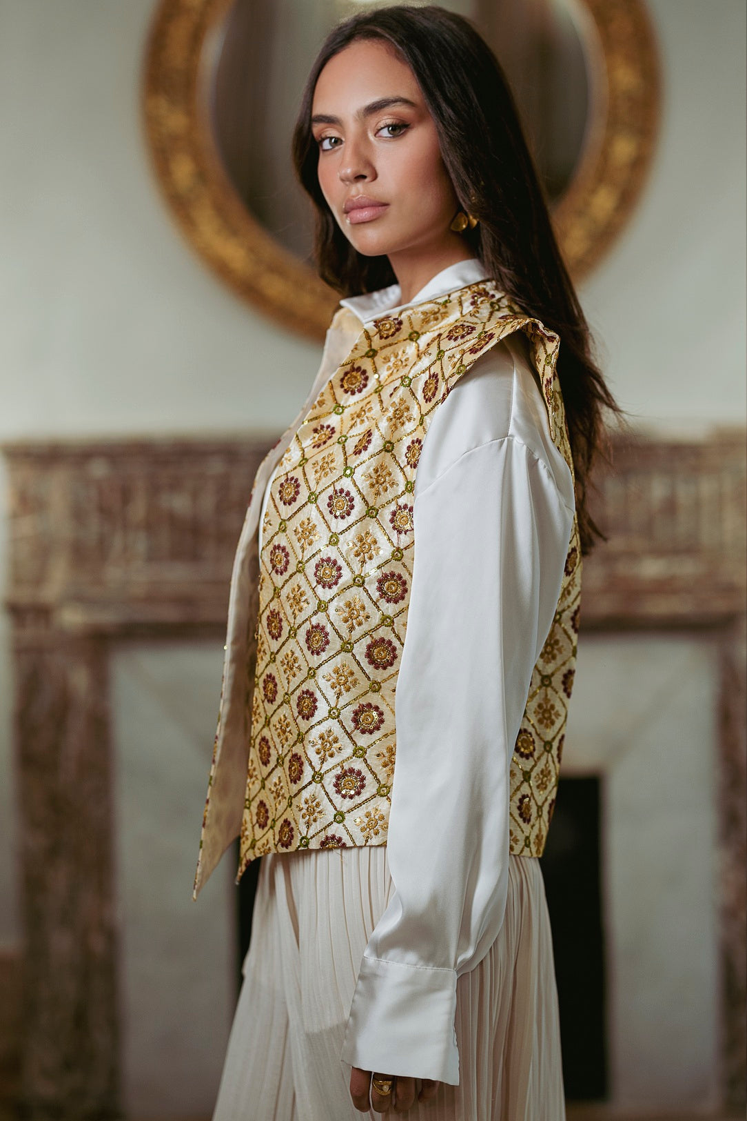 The Kaly Vest is a masterpiece made from EMBROIDERED INDIAN SHANTUNG, offering a perfect blend of sophistication and texture. The delicate embroidery elevates the lustrous fabric, adding a refined touch to this stylish piece.