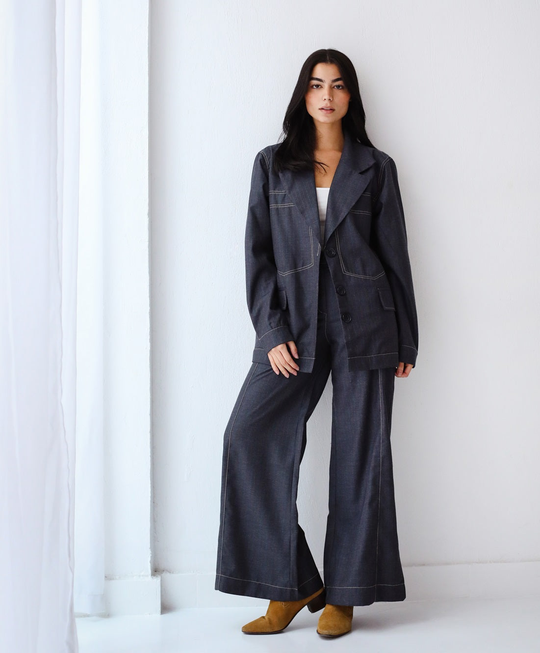 The Lineup Set is a striking striped ensemble featuring bold stroke lines that make a statement. This stylish set includes a chic blazer and high-waisted pants that widen at the bottom, creating a sophisticated silhouette.