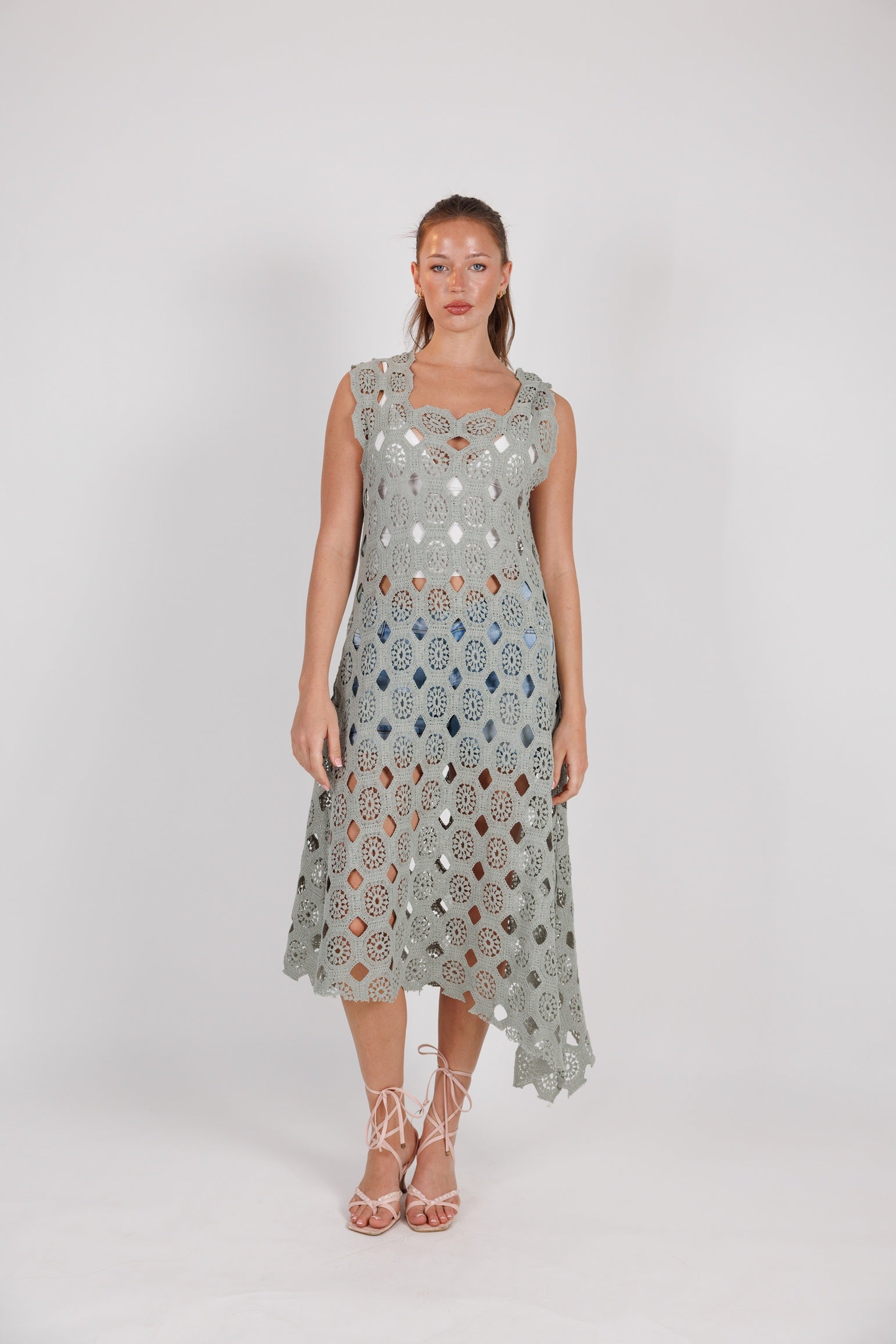 The Mosaic Dress is crafted from signature Gubure fabric, featuring geometric lace with a light, airy structure. Its modern cut makes it ideal for effortless summer styling.
