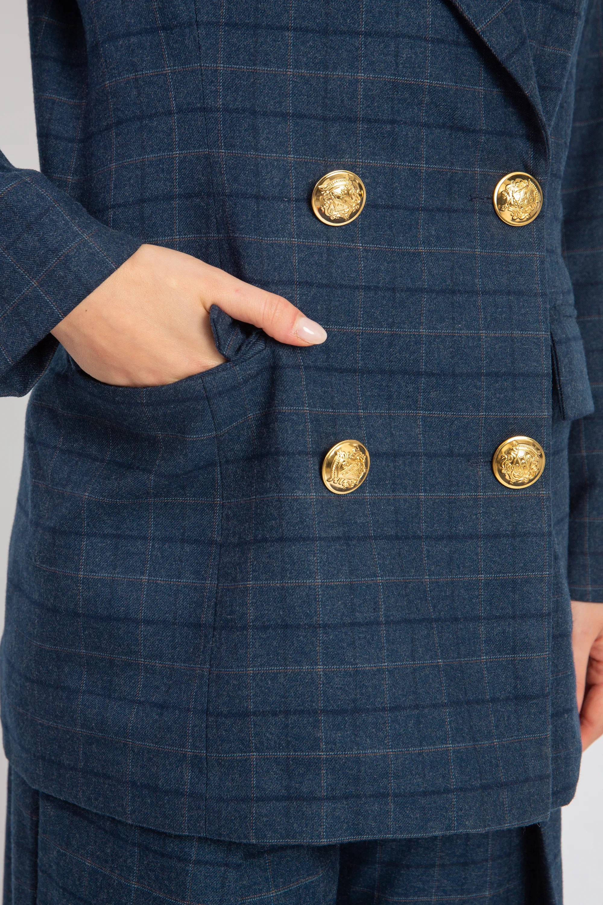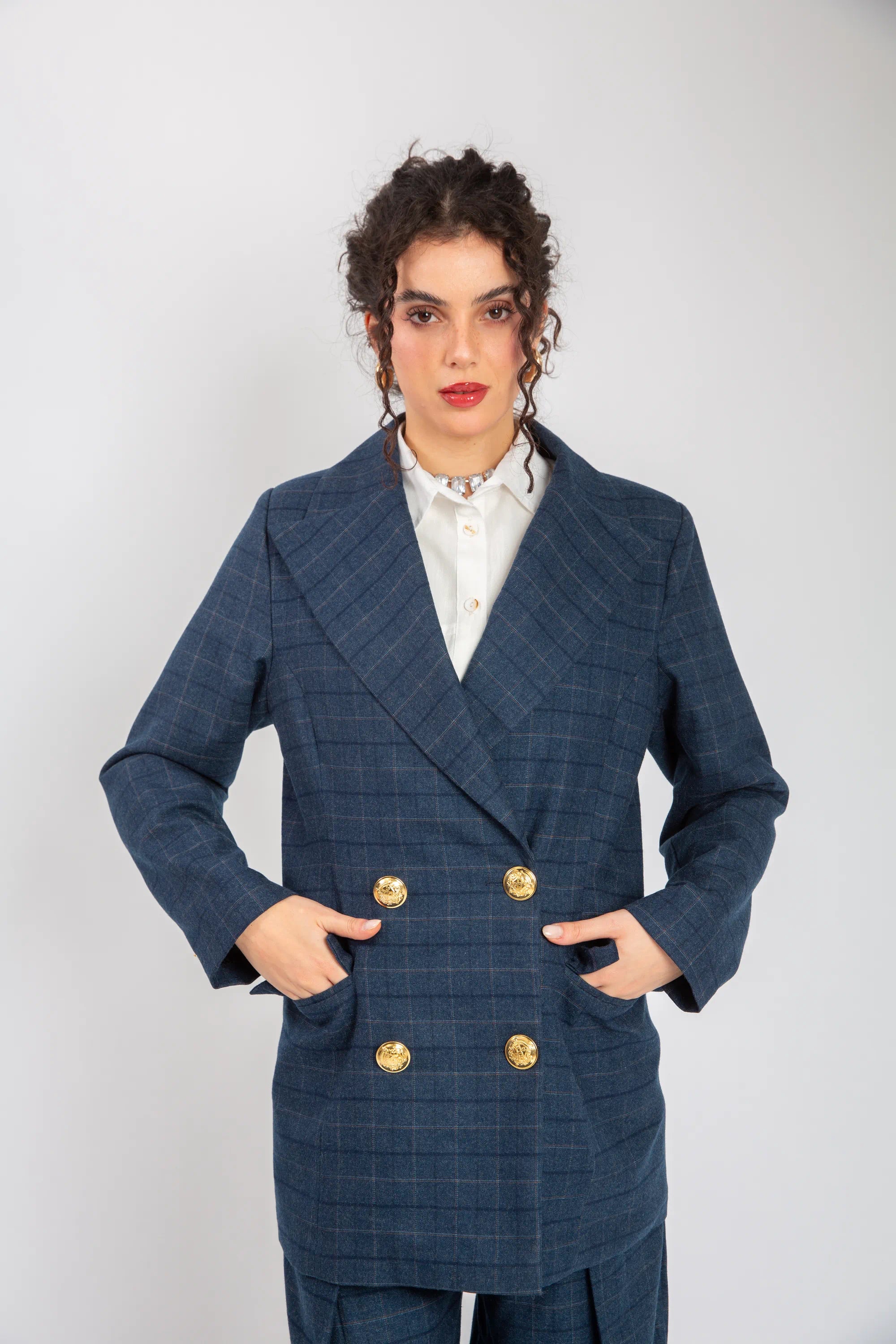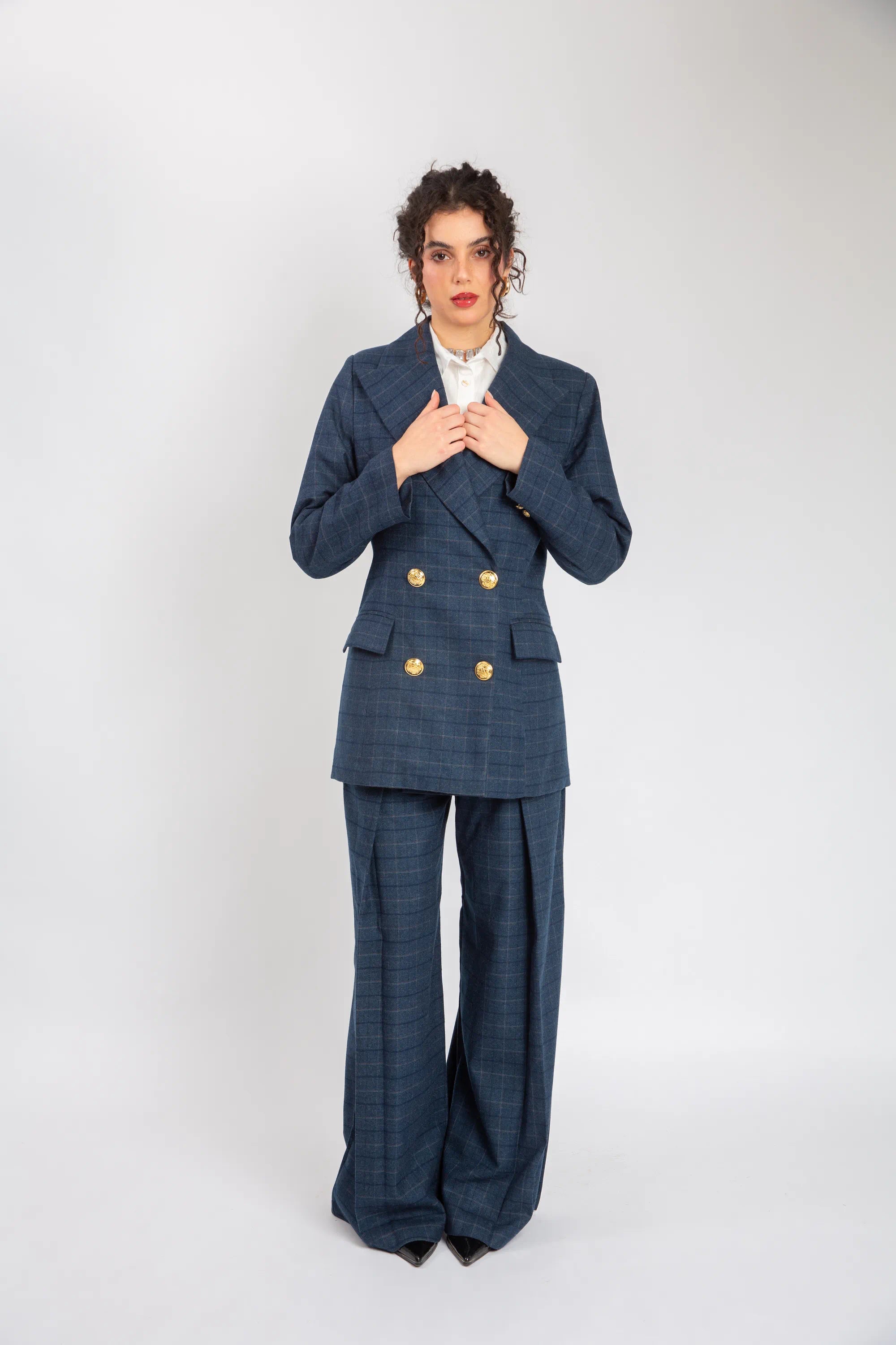 The Pinnacle Suit is crafted from soft, premium wool with a sharp double-breasted cut and gold buttons. Its subtle plaid texture and tailored silhouette create an effortlessly polished look for work and winter days.