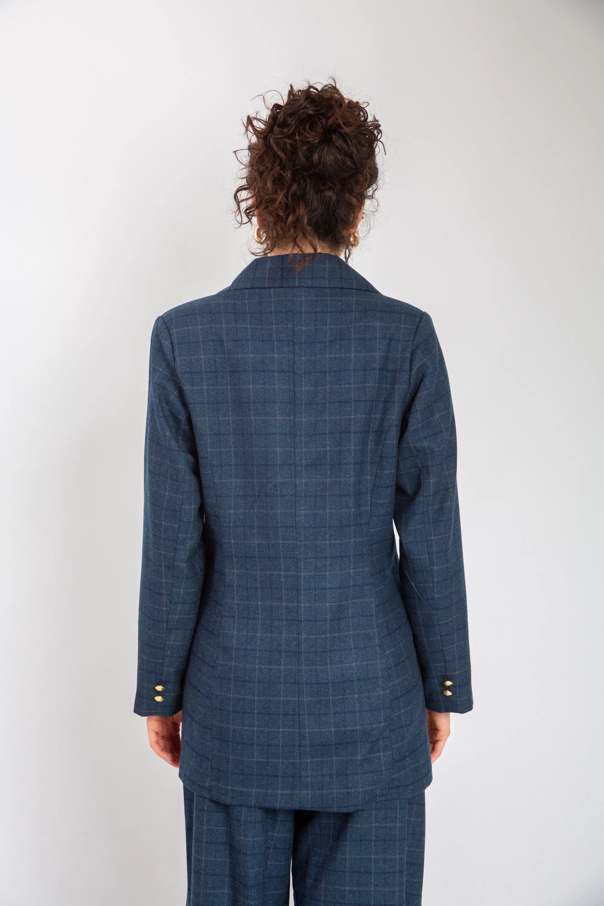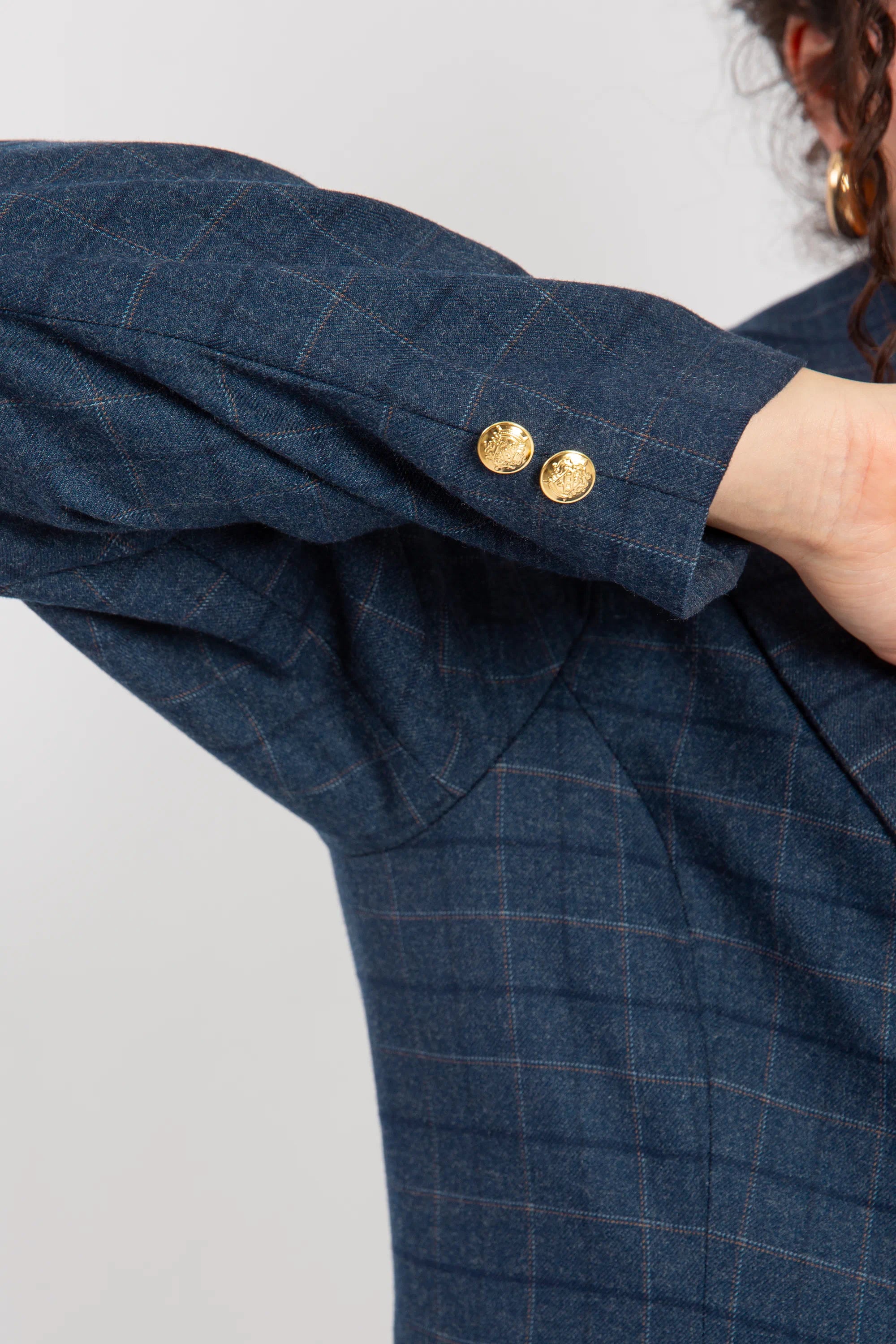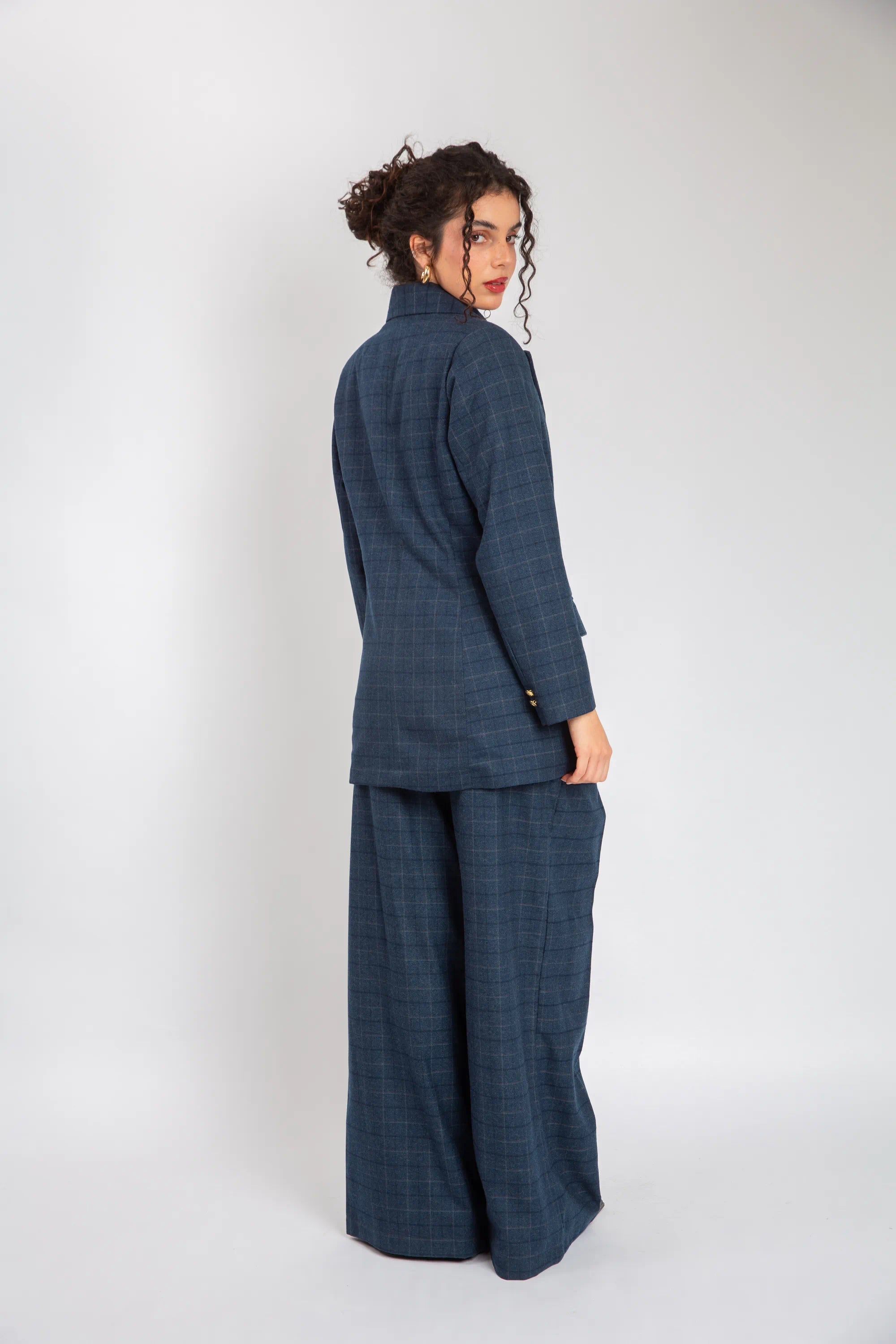 The Pinnacle Suit is crafted from soft, premium wool with a sharp double-breasted cut and gold buttons. Its subtle plaid texture and tailored silhouette create an effortlessly polished look for work and winter days.