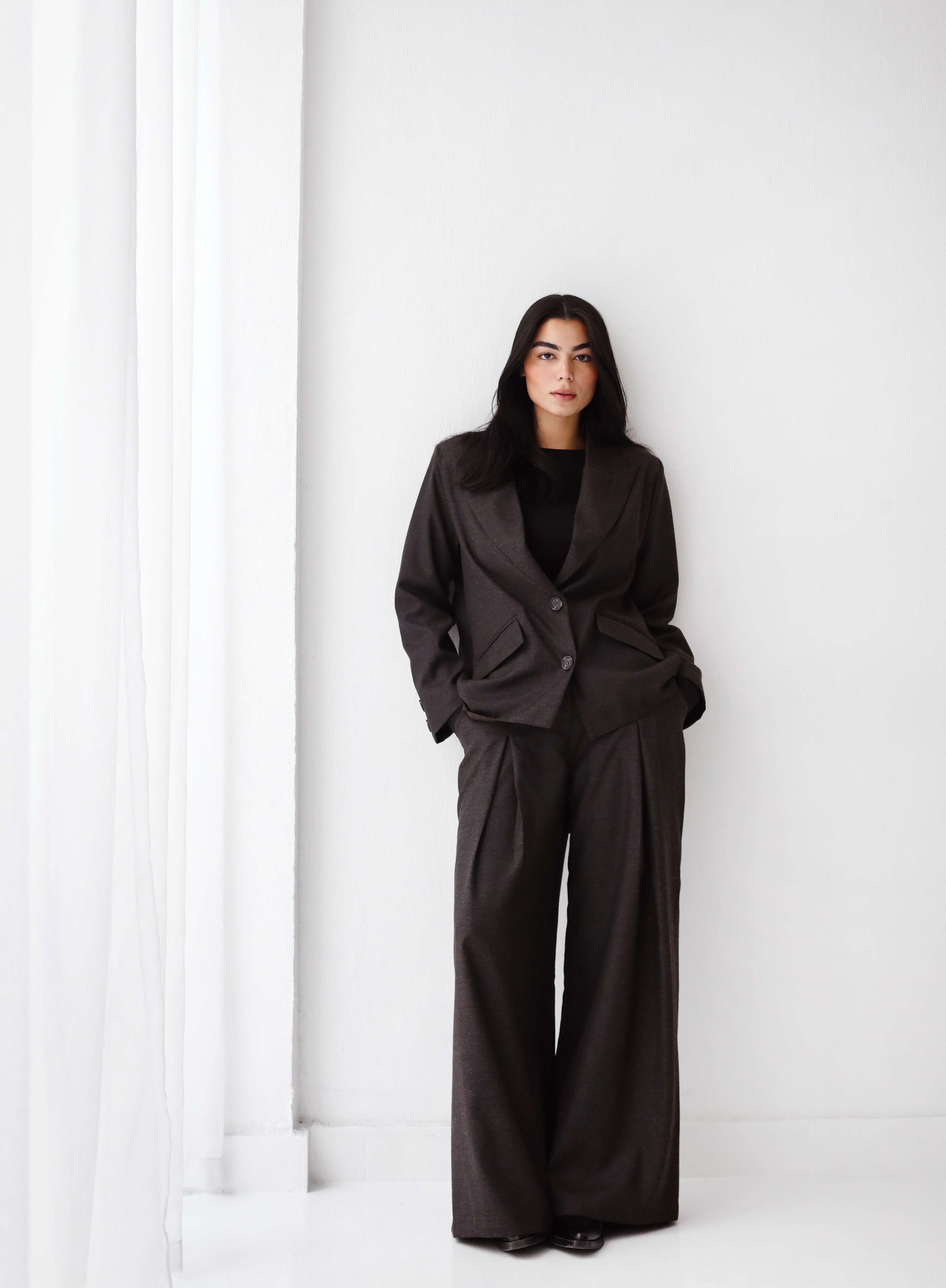 The Pocket Back Suit is a standout piece for formal occasions, featuring an innovative back pocket design. With long sleeves detailed by three chic pockets and flowy pants, this suit offers a perfect blend of elegance and modern style.