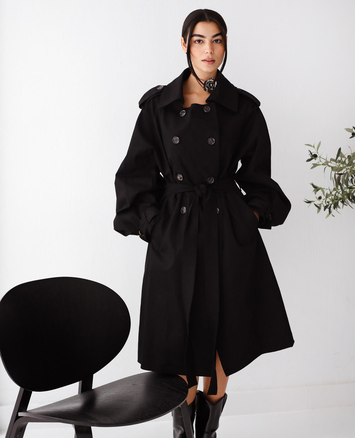 The Sleeky Coat is your ultimate style companion, designed with two practical pockets, elegant wing sleeves for a touch of drama, and a waist belt that defines your figure perfectly.